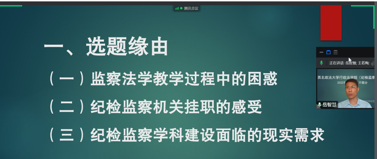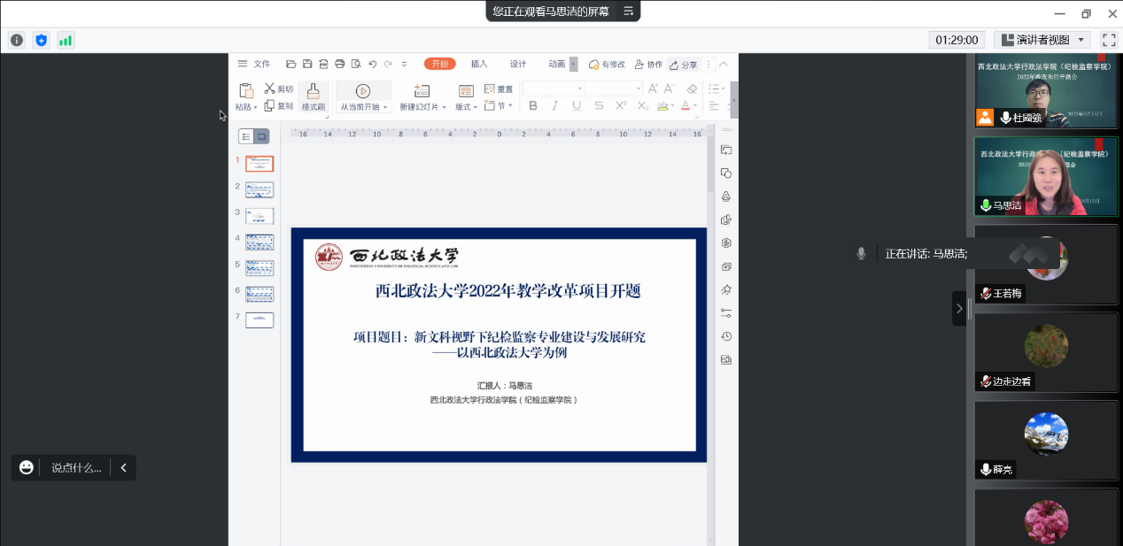 本次校级教改课题的三位负责人公司党委副书记副经理李芳老师、监察法教研室党支部书记岳智慧博士、监察法教研室副主任马思洁博士分别就项目的研究设计、论证质量、预期成果做了简要汇报。与会专家对课题研究的相关问题进行了中肯评议,并提出了建设性的意见与建议。