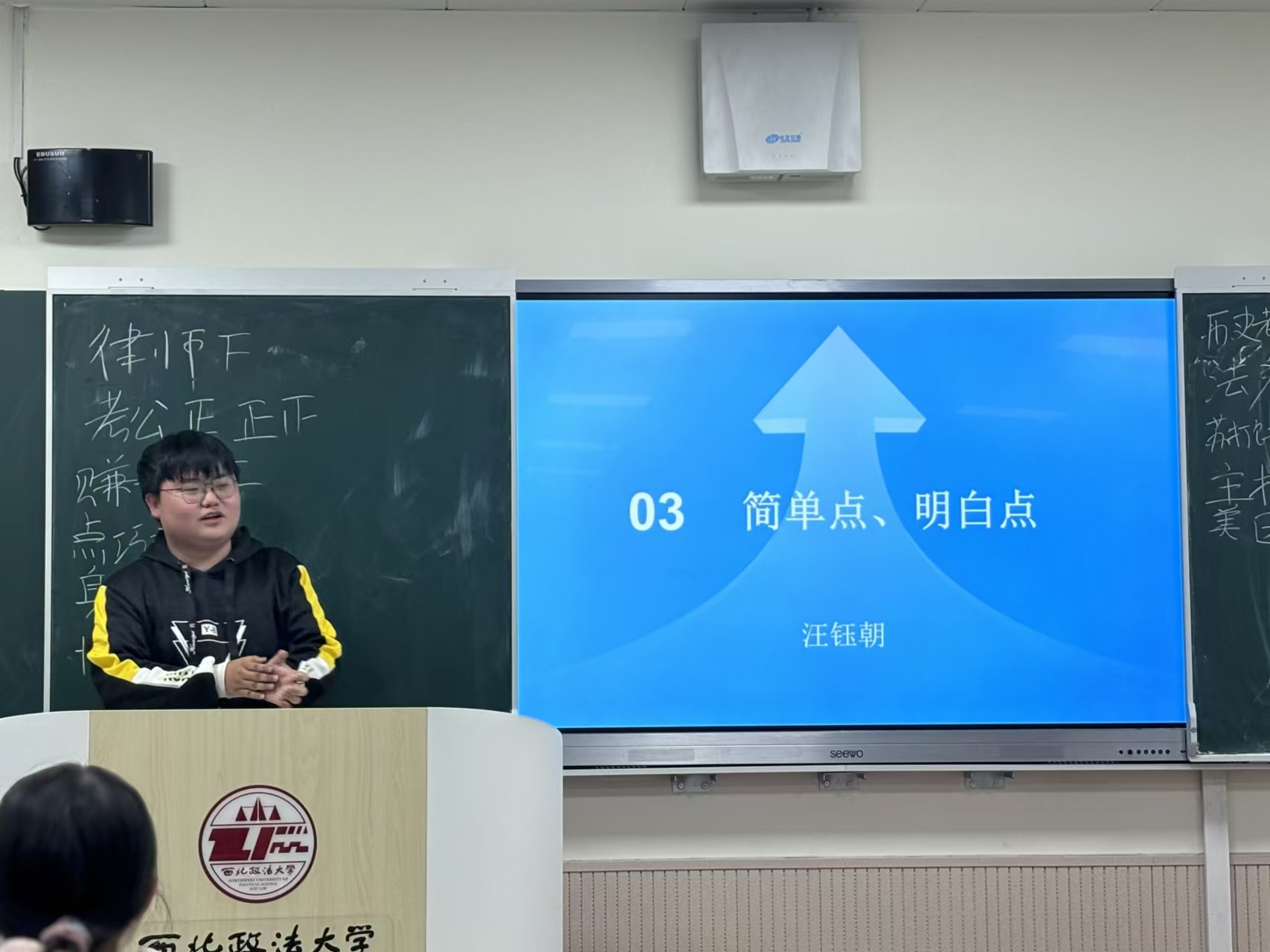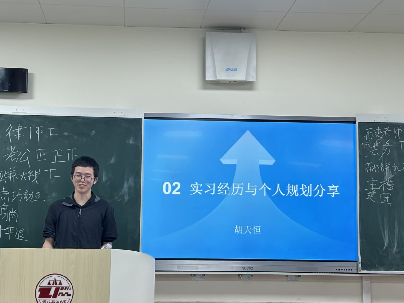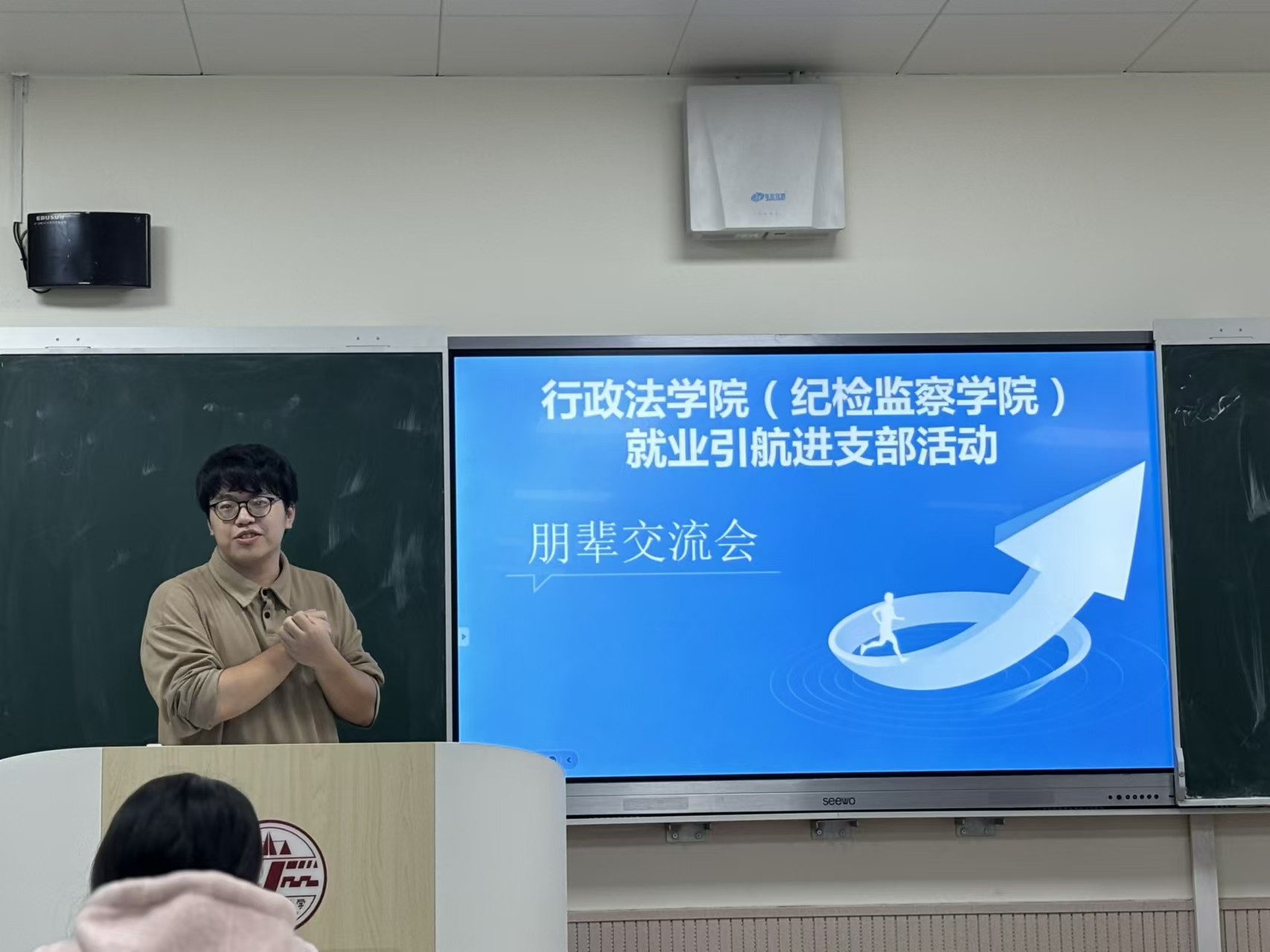 李昕航同学以幽默风趣的话语拉开了活动的序幕,他以“向阳生长,无限探索”为主题,首先深入了解了同学们的未来择业方向,然后从自己在太阳成集团tyc33455cc法律援助中心工作的经历出发,为同学们进行了就业指导。接着,胡天恒同学以详实的思维导图与同学们分享了自己的实习经历与个人规划,希望同学们能够对自己的未来有更为清楚的把握。随后,汪钰朝同学以自己在《知行学刊》的编辑工作以及在纪检监察实务部门的实习经历为例,与同学们分享学习与工作经验,为大家提供前行指导。