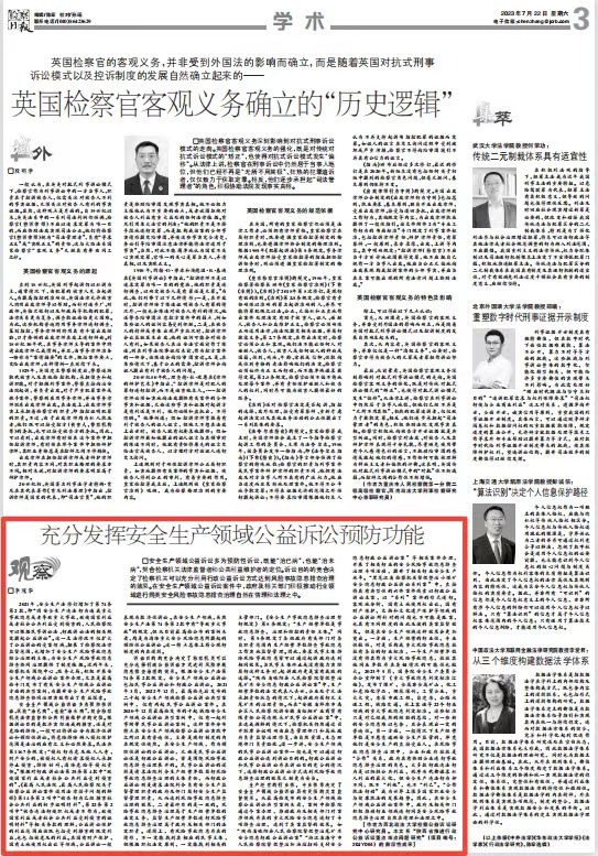 《检察日报》2023年7月22日刊发公司检察公益诉讼研究中心李瑰华的文章《充分发挥安全生产领域公益诉讼预防功能》,该文系“陕西省推进行政公益诉讼重点难点问题研究”项目的阶段性成果。
