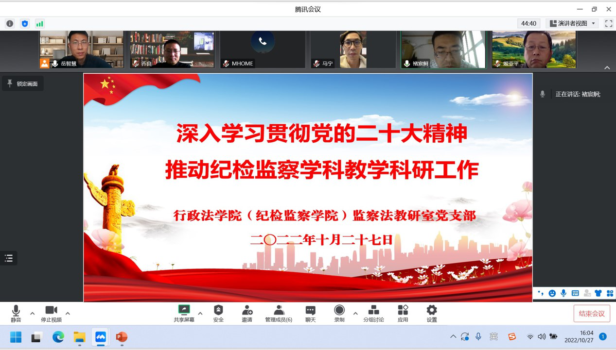 10月27日下午,监察法教研室党支部线上召开会议,深入学习领会党的二十大精神。会议由教研室党支部书记岳智慧同志主持,教研室姬亚平、褚宸舸、井凯笛、马宁、乔良五名同志参会。