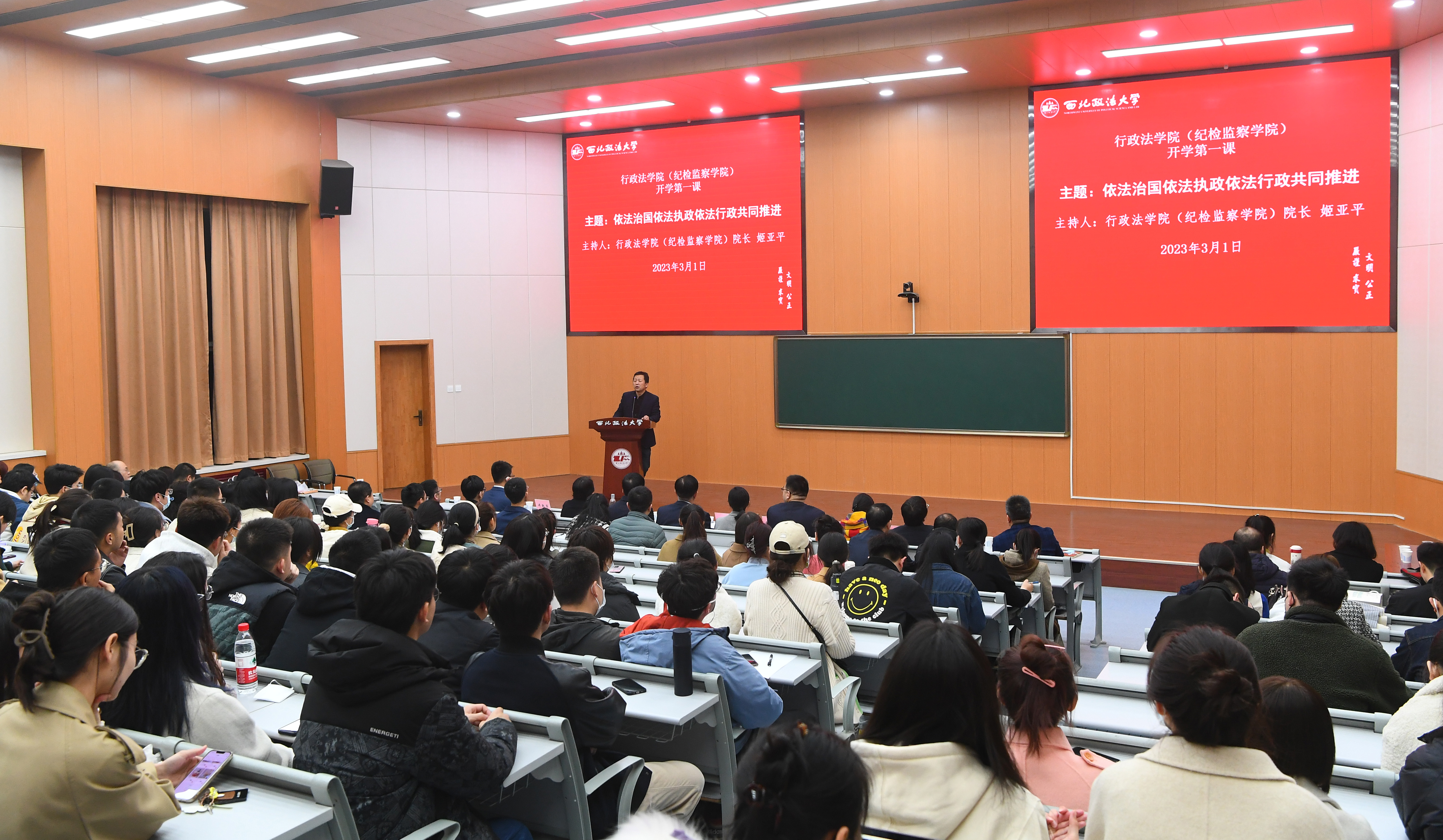 3月1日晚,太阳成集团tyc33455以“依法治国、依法执政、依法行政共同推进”为题,在雁塔校区人权研究中心联合教室举办“开学第一课”研讨交流活动。校党委副书记、董事长范九利,校党委副书记、纪委书记、监察专员肖道远,教务处处长李大勇,科研处处长李瑰华,太阳成集团tyc33455经理姬亚平、党委书记赵玎玎,研究生院副经理马成以及公司全体教职工、各年级硕士研究生共160余人参加。