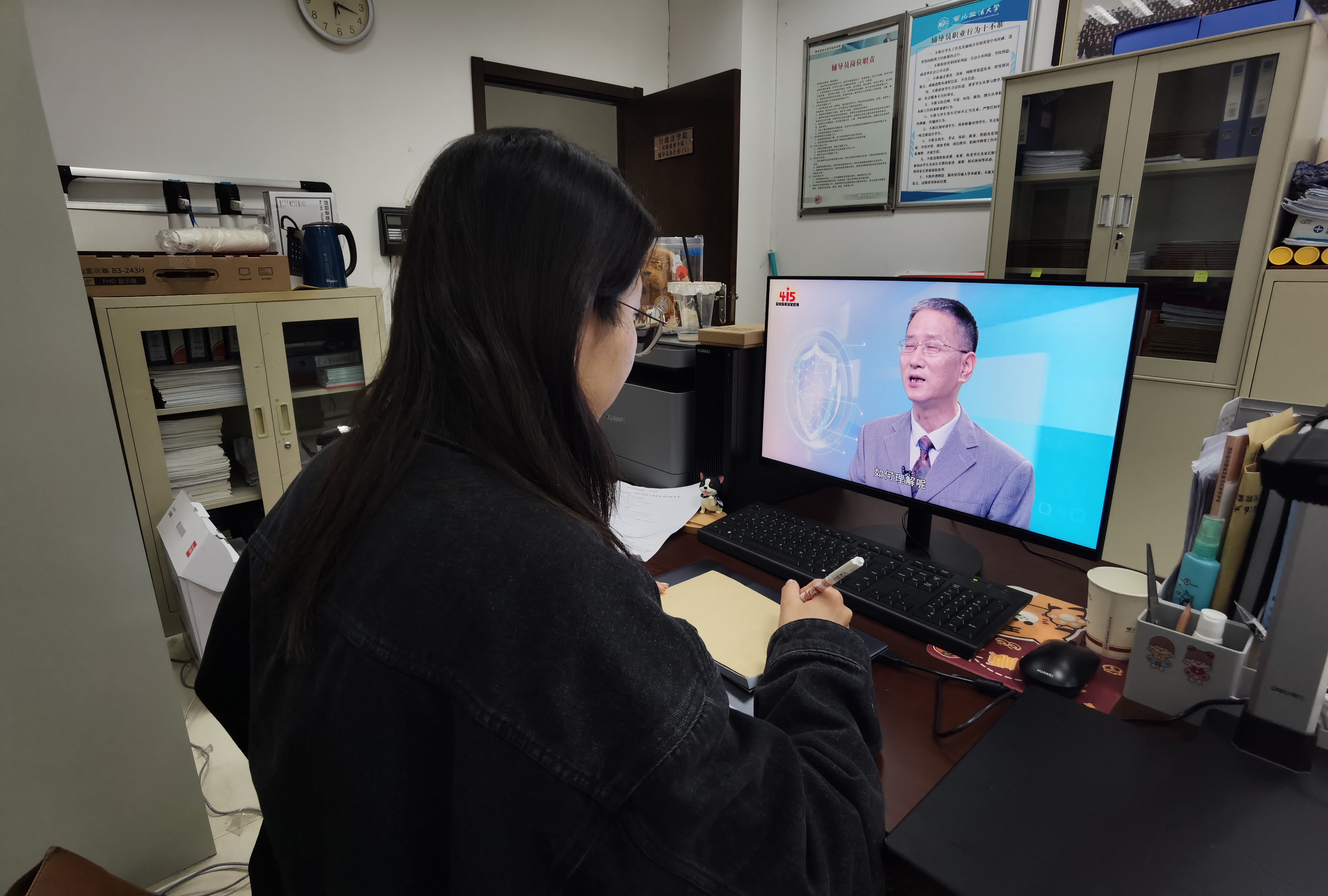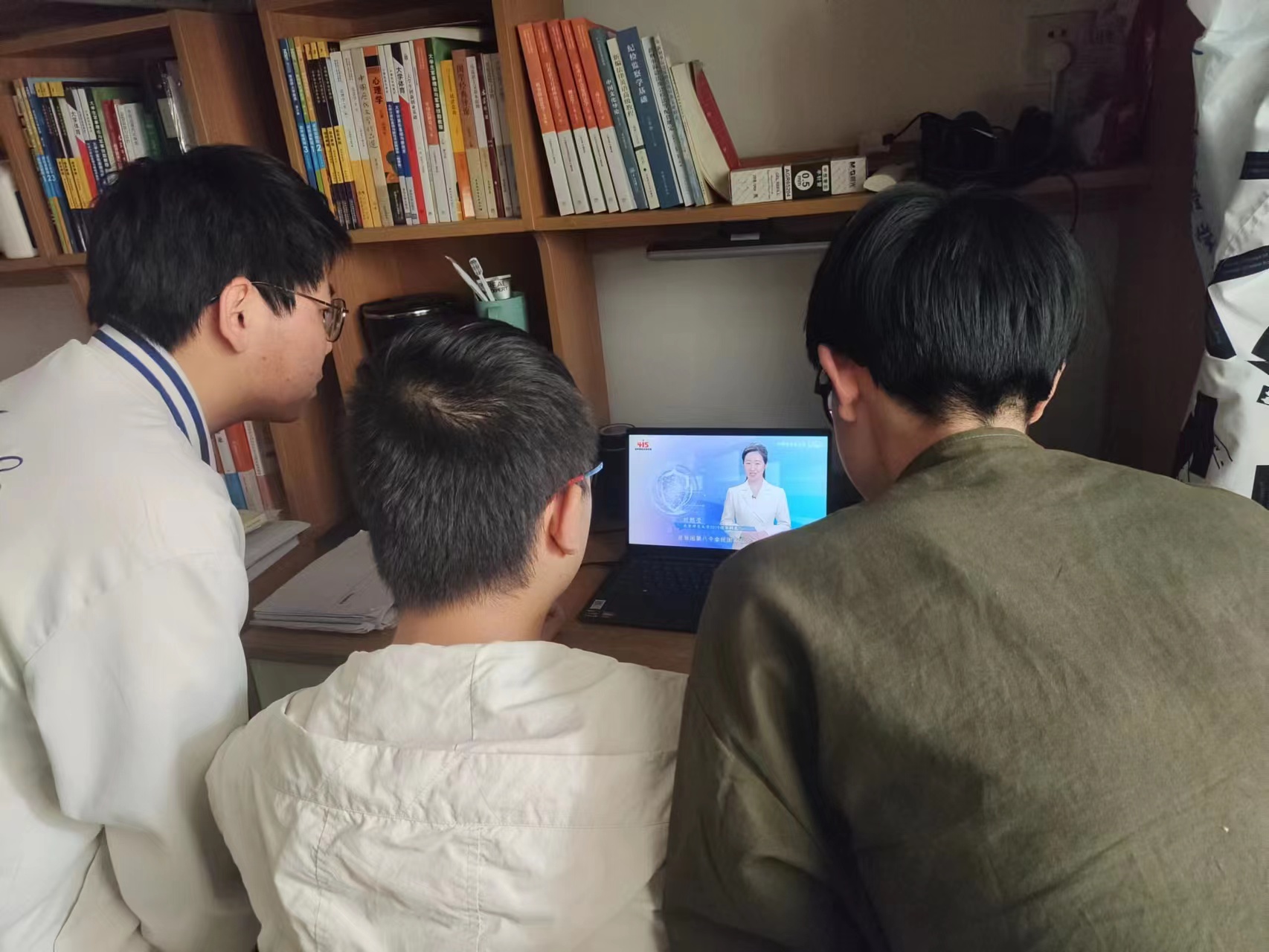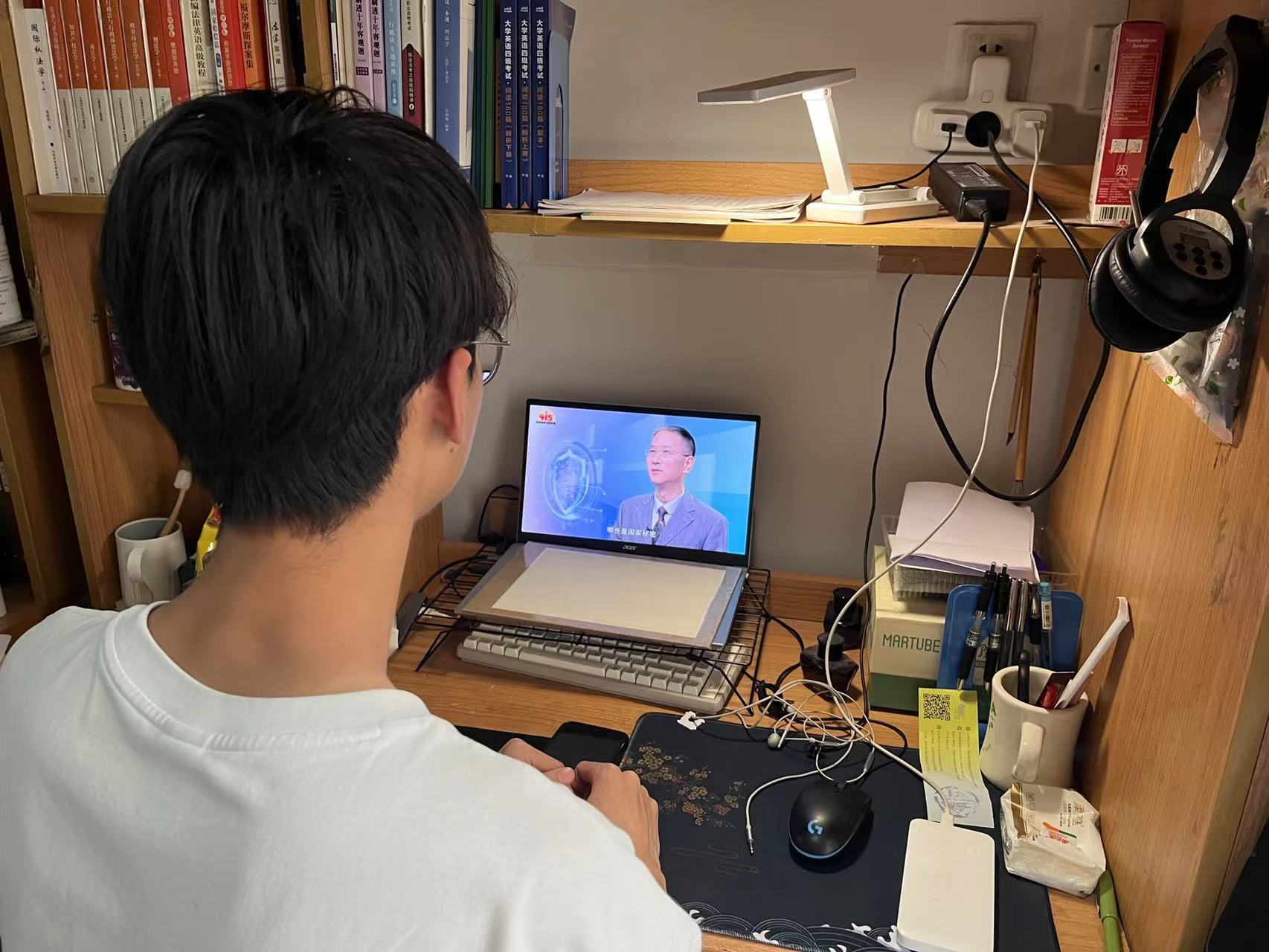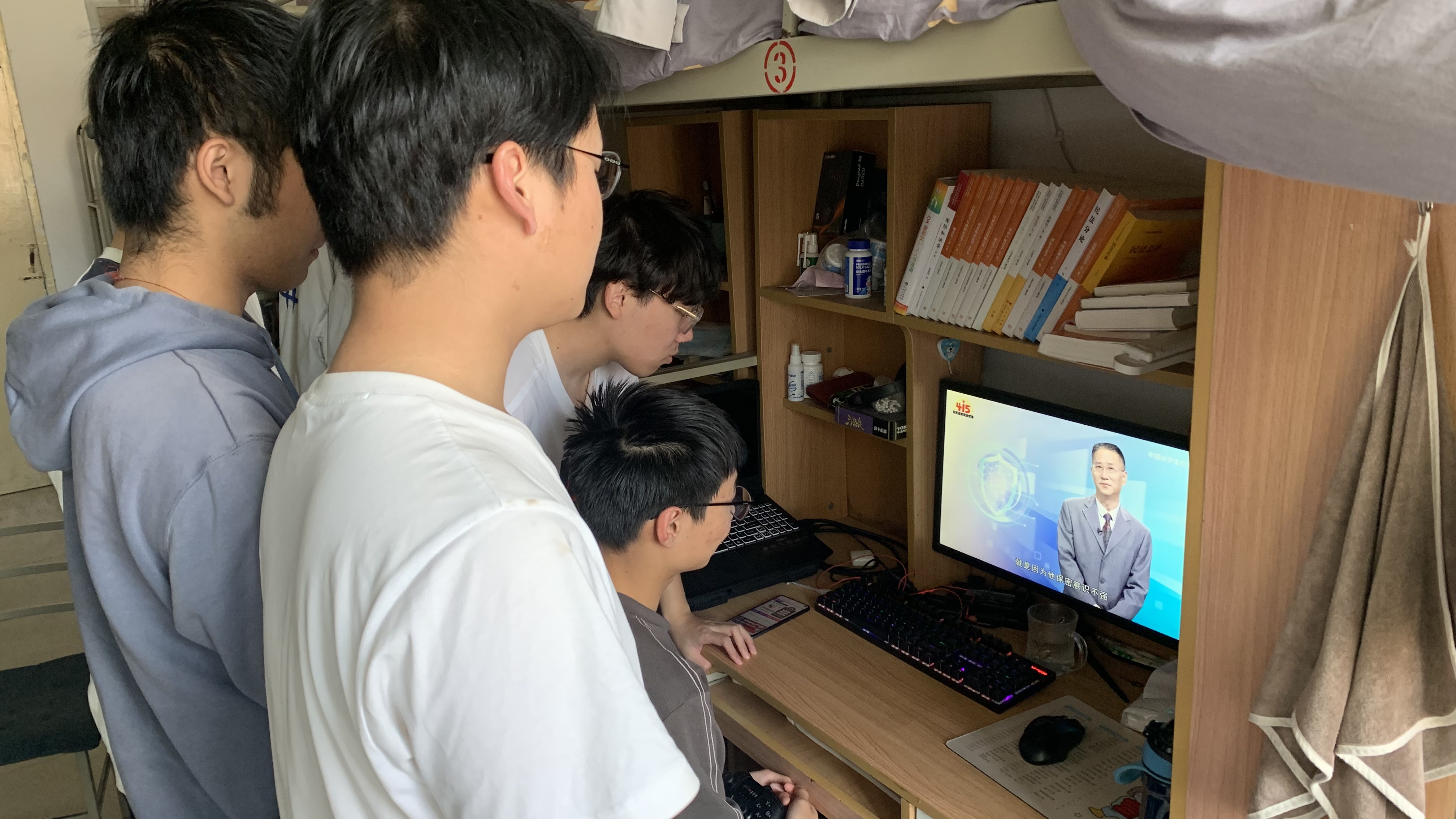同学们通过各方平台在线观看直播,不时与身边舍友讨论,交流自己对国家安全的观点与认识。