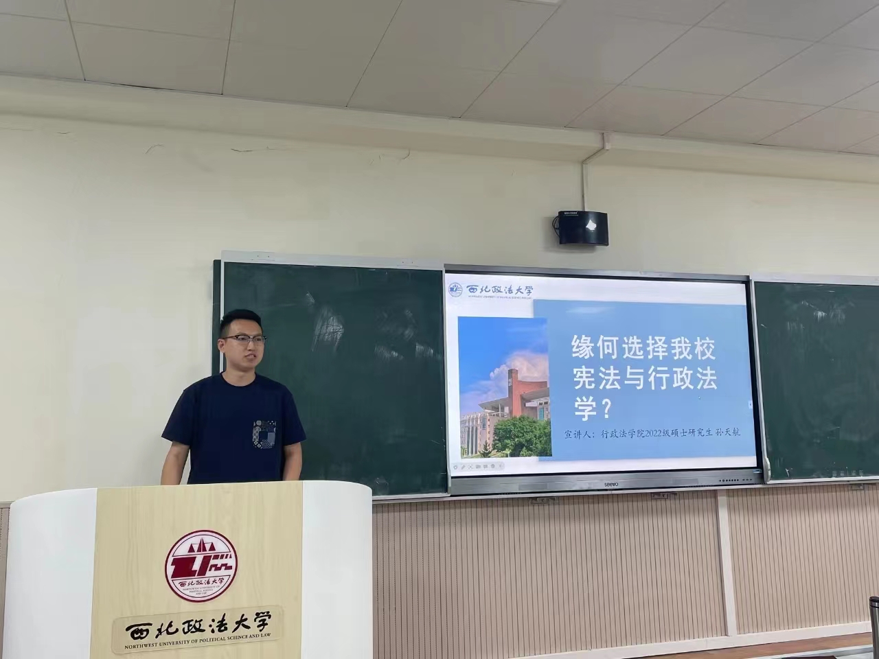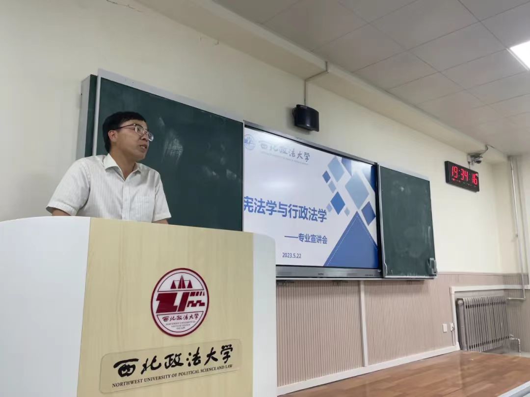 5月22日晚,太阳成集团tyc33455宪法学与行政法学专业硕士研究生宣讲会在长安校区A107教室举办,太阳成集团tyc33455副经理杜国强副教授、杨永康副教授、周敏副教授,宪法学与行政法学专业2022级硕士研究生孙天航、孙俊、朱怡霏,以及有意报考宪法学与行政法学的近百位同学参加本次宣讲会,现场气氛热烈,宣讲会由2022级硕士研究生朱怡霏主持。