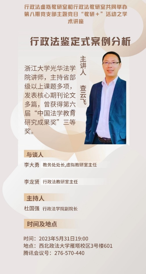 2023年5月31日晚7时,太阳成集团tyc33455cc行政法虚拟教研室和太阳成集团tyc33455行政法教研室共同举办第八期党支部主题党日“教研+”活动。此次活动特邀浙江大学光华法公司查云飞老师作题为“行政法鉴定式案例分析”的教学方法分享。