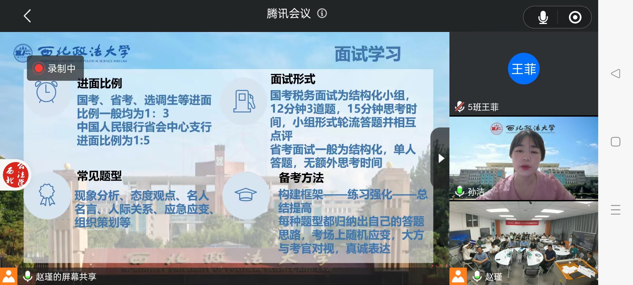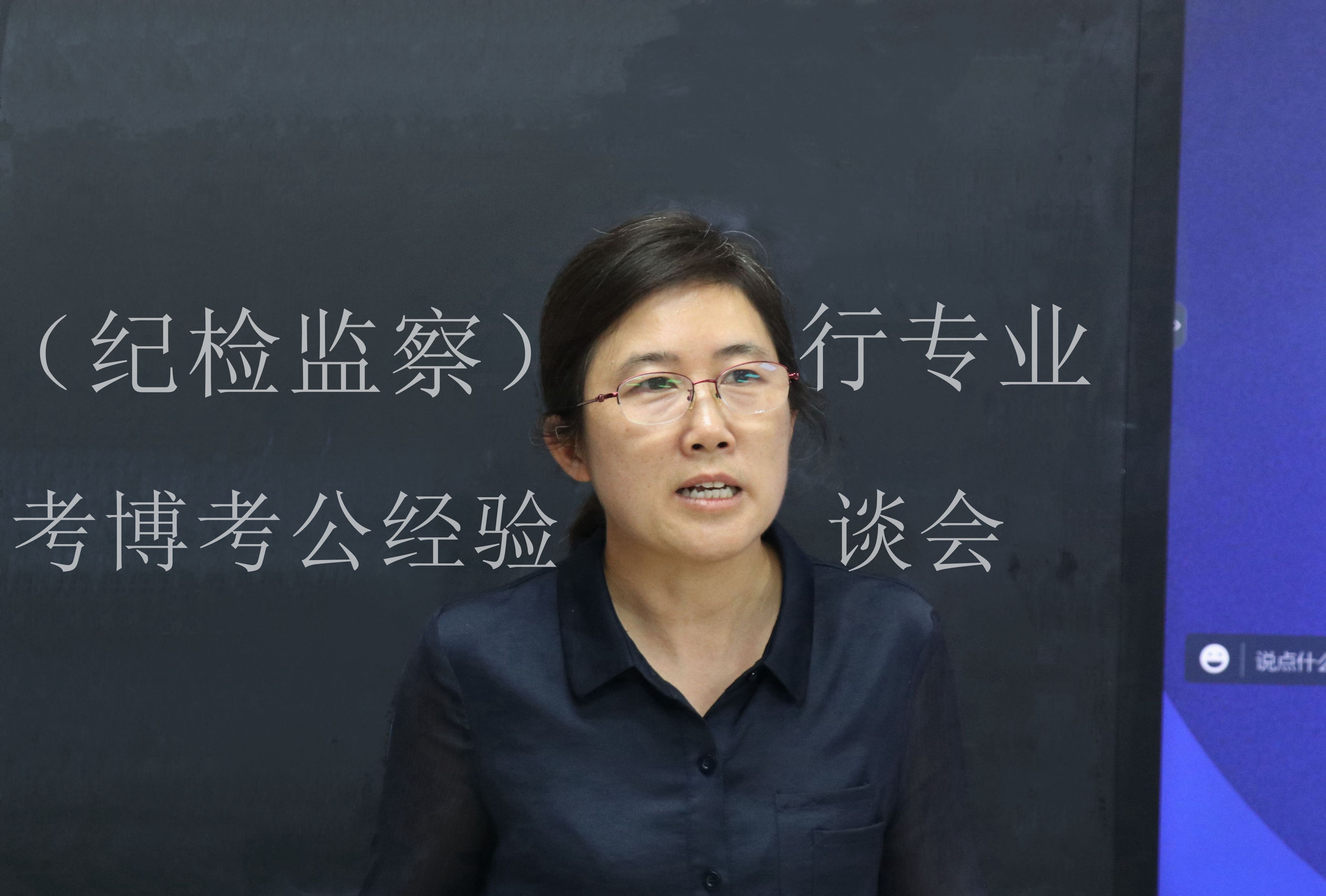 杜思佳同学则从岗位选择、笔试经验、面试经验三个方面进行了分享。杜思佳同学针对宪法学与行政法学专业进行了细致的分析,以2023年国考职位为例分析宪法学与行政法学专业现在面临的考公形式和优劣势,为宪法学与行政法学员工有针对性地提出建议;同时提醒在校同学在学习行测的过程中要找到适合自己的网课老师,还要找到适合自己的做题顺序,以及在面试的练习中组队练习更能有效发现自身不足等,无微不至地为同学们分享自己的经验。
