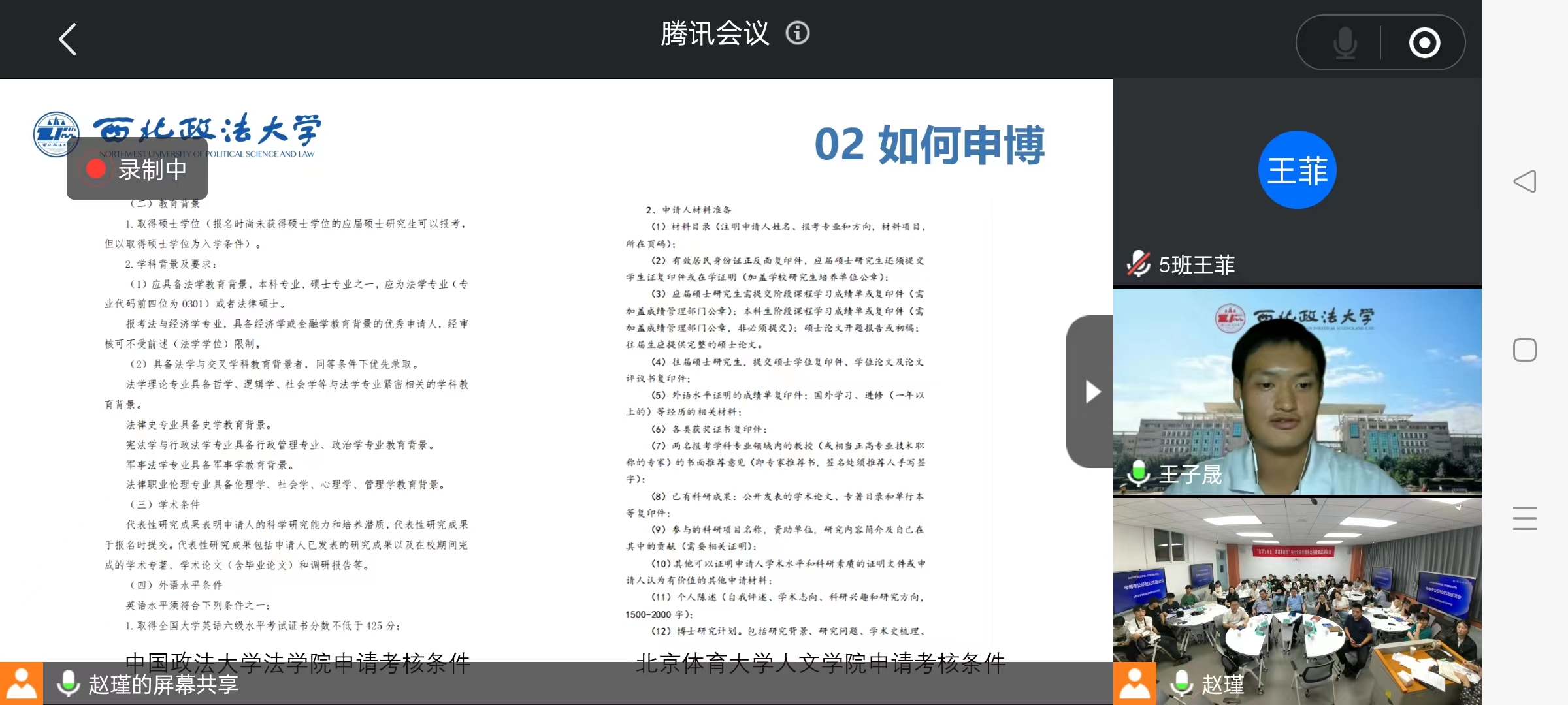 王子晟博士生对法学博士的“申请考核”和“普通招考”的两种主要招生方式进行了深入浅出的介绍,从如何确定研究方向、如何联系导师、如何准备考试和准备哪些相关材料四个方面介绍了申博的相关事项。除此外王子晟博士生还提到“兴趣是最好的老师”,建议在校研究生试着将兴趣和所学结合,试着将自身的兴趣爱好结合到科研之中,能更好激发自身学术热情,以达到事半功倍的效果。