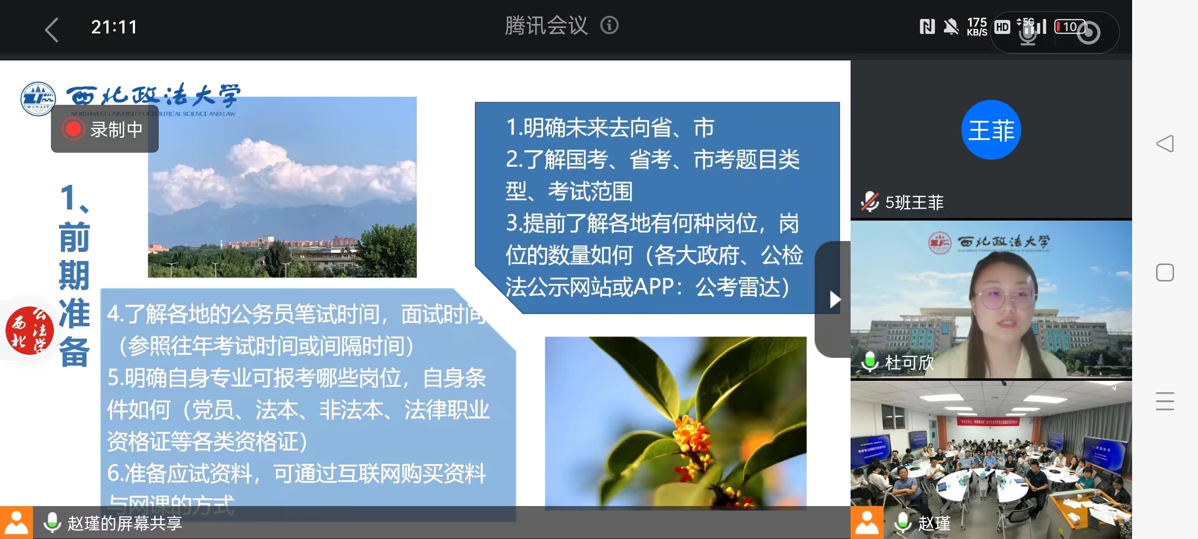 杜可欣同学围绕考公这一主题就前期准备、中期学习、岗位选择与面试方法四个板块进行了分享。杜可欣同学认为在前期要做好充分的前期准备,明确未来去向,提前了解各地有何种岗位;在中期学习中对行测和申论要分别对症下药,有针对性地选择好学习方法;在岗位选择与面试中则建议尽可能明确自身条件,多参加考试,积累经验,并且告诫同学们在面试时一定要自信大方,从容勇敢。