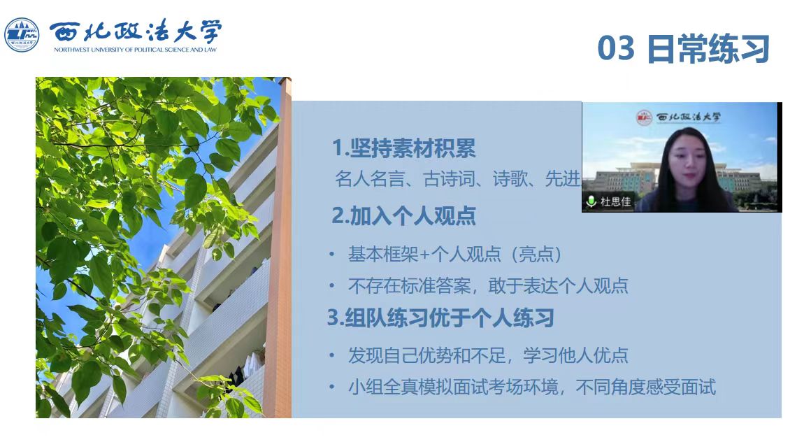 孙佳灵同学就如何选择和如何备考两方面经验进行了总结分享。在选择方面,孙佳灵同学提出要根据个人情况充分进行考虑,例如距离、人际、风土对地域的选择,还有工作性质是否符合个人、专业是否对口等;并且就如何备考为在校研究生提出了详细的时间规划,建议我们要“抓住真题,善于复盘”、“求质不求量,求精不求多”。