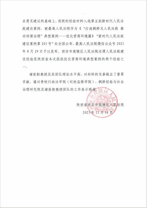 近日,西安市高陵区人民法院致函公司,对公司褚宸舸教授团队为“枫桥式”人民法庭典型案例的总结提炼工作作出的重要贡献表示感谢。