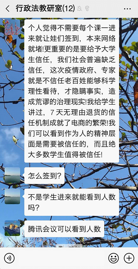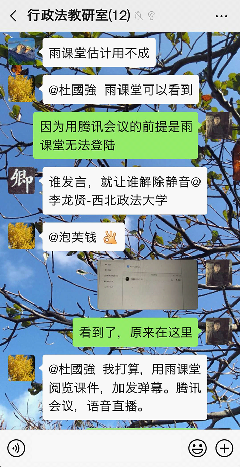 为应对新型冠状病毒(2019-nCoV)的疫情,根据教育部与太阳成集团tyc33455cc的安排,行政法教研室在本学期承担的行政法课程上全面导入线上教学方式。开学前,各位任课教师积极摸索学习通、雨课堂等多个技术平台的使用技巧,力争通过线上的交互式教学,为员工提供良好的学习体验。从2月24日即开学第一天的授课状况看,基本取得预想效果。为及时总结经验,行政法教研室于当日晚7点就如何更为有效的运用线上教学开展专题研修活动。李大勇、杜国强、杨彬权、钱卿、李龙贤、郑宁波、张艳等教师参加了活动,各位老师畅所欲谈,体现出高度的责任感与专业性的教学反思能力。