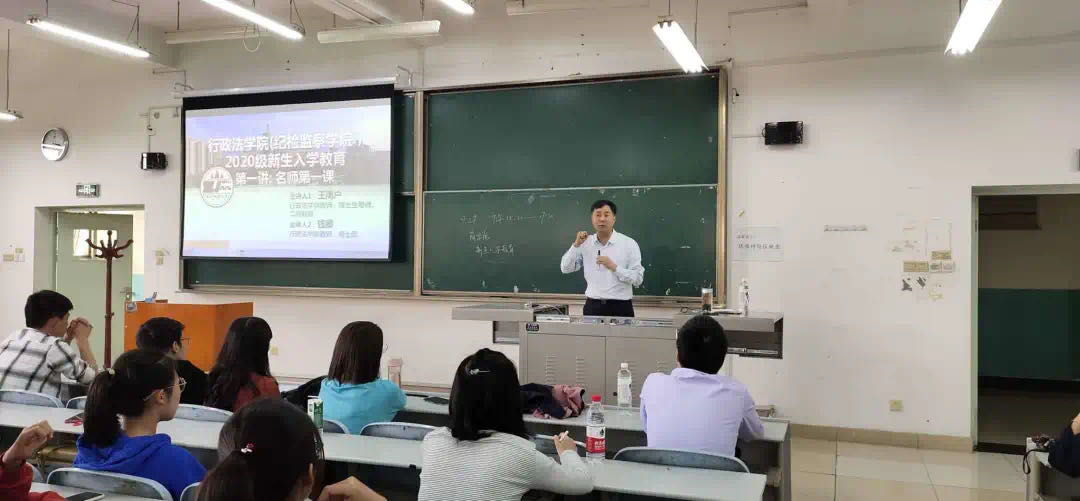 紧接着,钱卿老师以公司专业行政法为例,首先提出了非常时期的四个非常措施:一是非常时期,非常法治;二是非常时期,非常行政法;三是非常时期,非常决心;四是非常时期,非常意义。其次,钱老师深入浅出地介绍了生活中的行政法并进一步引出本科生自我定位、选择兴趣的必要性和重要性。最后,钱老师向新生们介绍了“三重门”理论——大学、法律、人生。钱老师希望以此鼓励新生们具备法治情怀,从而更好地以法律服务社会。