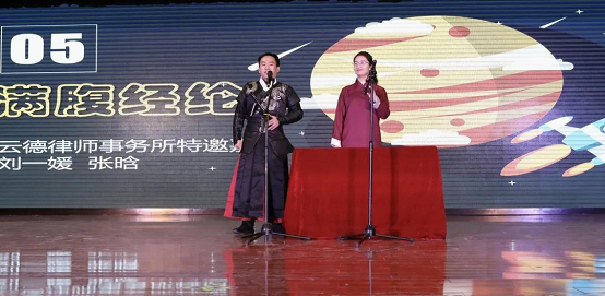 相声《满腹经纶》一改歌曲之悠扬,这场由陕西云德律师事务所刘一媛律师、张晗律师带来的表演,内容紧扣当今实,又与中国历史经典文化、法律文化色彩巧妙结合,幽默风趣亦暗含着道路自信、理论自信、制度自信、文化自信,赢得了老师、同学们阵阵喝彩。