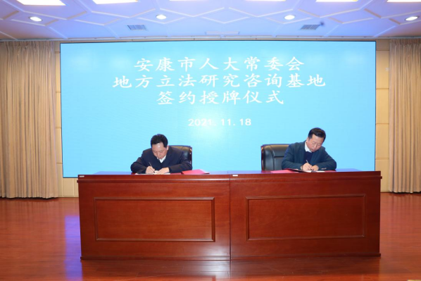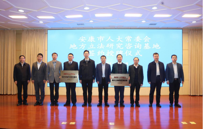 安康市人大常委会主任邹顺生,安康市委常委、副市长石宏,安康市人大常委会副主任郑小东、安康市人大常委会法工委副主任邹刚等出席会议。安康市人大常委会法工委与公司签订了地方立法合作协议,安康市人大常委会主任邹顺生向公司授予“安康市地方立法研究咨询基地”牌匾。
