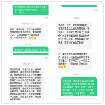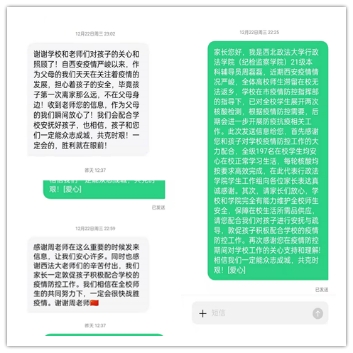 西安此次新冠疫情不仅牵动着全体师生的心,更牵动着来自五湖四海同学们家人的心。为抚慰家长的担忧与焦虑,公司辅导员老师为员工的父母一一发送短信,并通过公众号推送向家长展示员工在校学习生活,与员工们保持在同一战线,家长们纷纷表示理解与支持,送来一句句的暖心话语,感谢公司与老师们为同学们的辛勤付出,并积极配合公司的防疫工作,与同学们积极沟通及时安抚疏导。家长的充分理解给予了同学们精神上的支持,更给予了我们战胜疫情的信心!