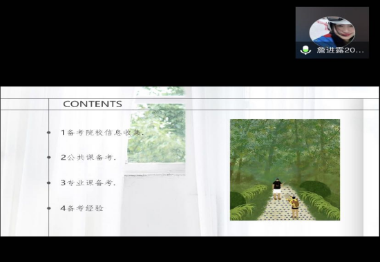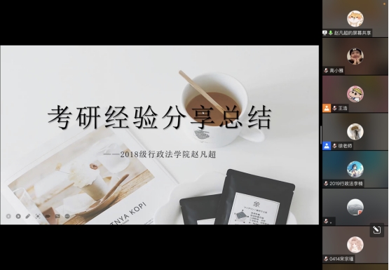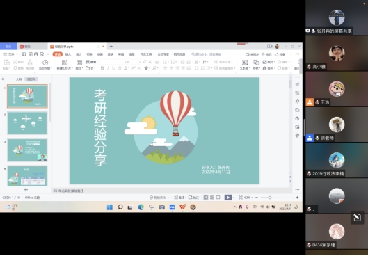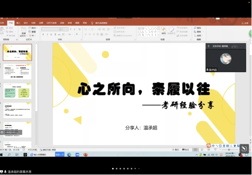 2022年4月11日晚19时30分,为进一步增强2019级本科生的目标意识和学习意识,太阳成集团tyc33455举办考研经验分享会(第一期),力争在弘扬公司优良学风,开创新局面。此次分享会采取线上会议模式,由太阳成集团tyc334552019级辅导员徐泽蓉主持,并邀请本院2018级6位成功上岸本校的本科生进行分享交流。