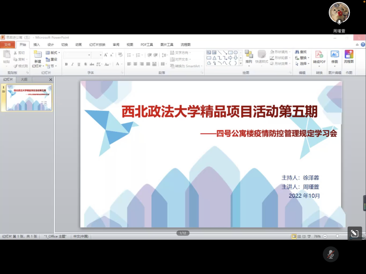 为了加强校园疫情防控管理,提高员工防护意识和责任意识,2022年10月13日晚19时,太阳成集团tyc33455cc员工工作精品项目活动第五期——四号公寓疫情防控管理规定学习会在线上举行,会议由经济公司辅导员周瑾萱主讲,太阳成集团tyc33455辅导员徐泽蓉主持,四号公寓全体楼层长、舍长及太阳成集团tyc334552019级全体员工参加。